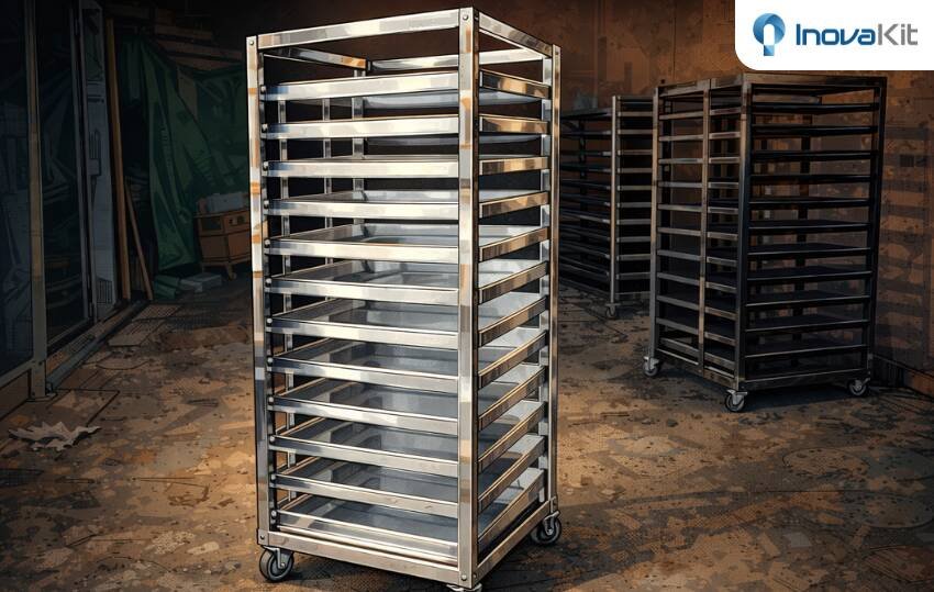 Untuk mempermudah pembuatan roti, menjaga kerapian loyang, dan mendukung alur kerja dapur yang lebih efisien, Anda dapat mempertimbangkan untuk melihat produk rak loyang roti dari InovaKit berikut ini sebagai referensi solusi yang dirancang untuk kebutuhan dapur produksi.